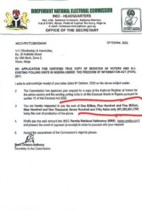 The Independent National Electoral Commission (INEC) has approved a request by a law firm for the release of the certified true copy of the National Register of Voters and all existing polling units across Nigeria, pegging the cost of production at N1.5 billion.