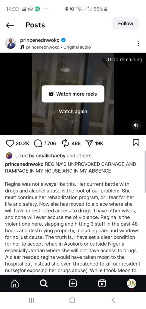 In a lengthy post and a short video shared on his Instagram handle #princenednwoko on Sunday, Nwoko claimed the actress was battling drug and alcohol abuse, which he said was at the root of the crisis rocking their marriage.