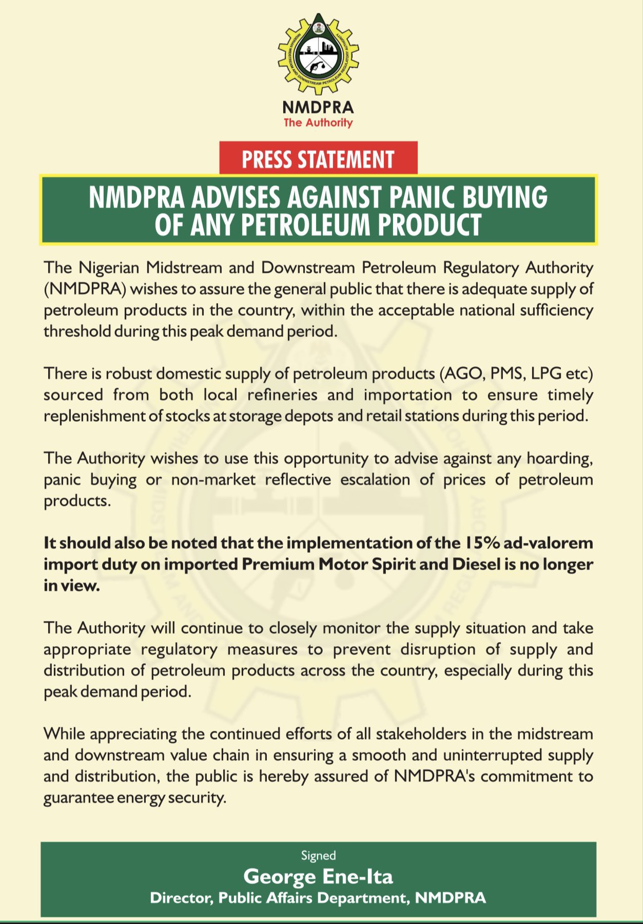 The statement, signed by the NMDPRA Director, Public Affairs Department, George Ene-Ita, also assured Nigerians that there is an adequate supply of petroleum products in the country during the peak demand period of the incoming yuletide.