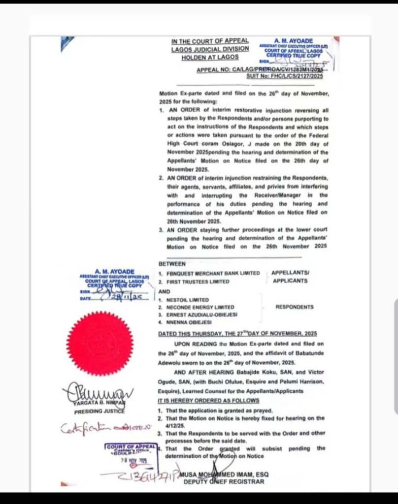 In an order dated October 22, 2025, Justice Dipeolu authorised the applicants—acting on behalf of a consortium of creditor banks—to take possession and assume control of Nestoil’s assets and subsidiaries under receivership.