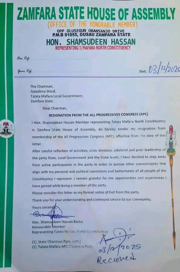 In a letter dated December 3, 2025, addressed to the APC chairman of Galadima Ward, Talata Mafara Local Government Area, and titled “Resignation from the All Progressives Congress (APC)”, the lawmaker lamented that persistent divisions had made effective participation impossible.