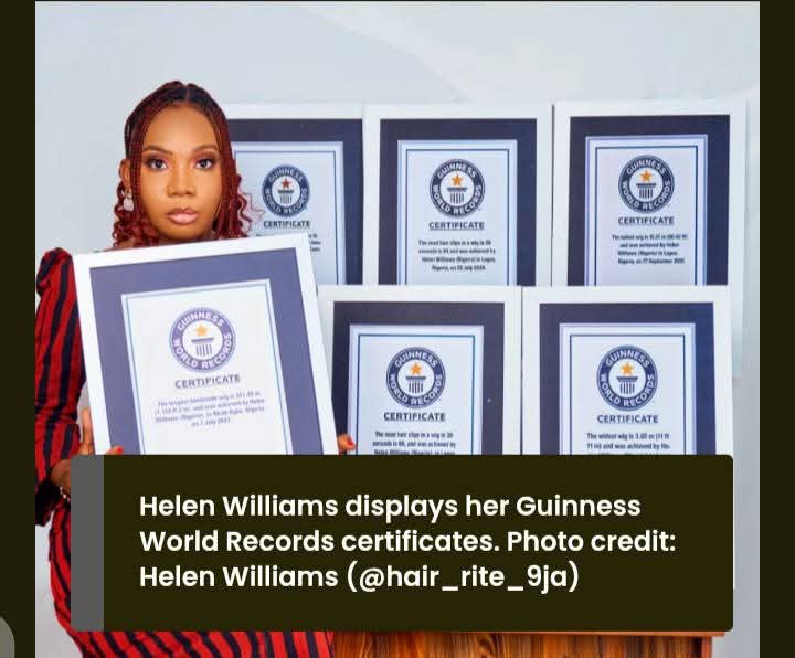 The record body noted that Williams had earlier set records for the world’s longest handmade wig, measuring 351.28 metres, and the widest wig at 3.65 metres, making the tallest wig her third major global title.