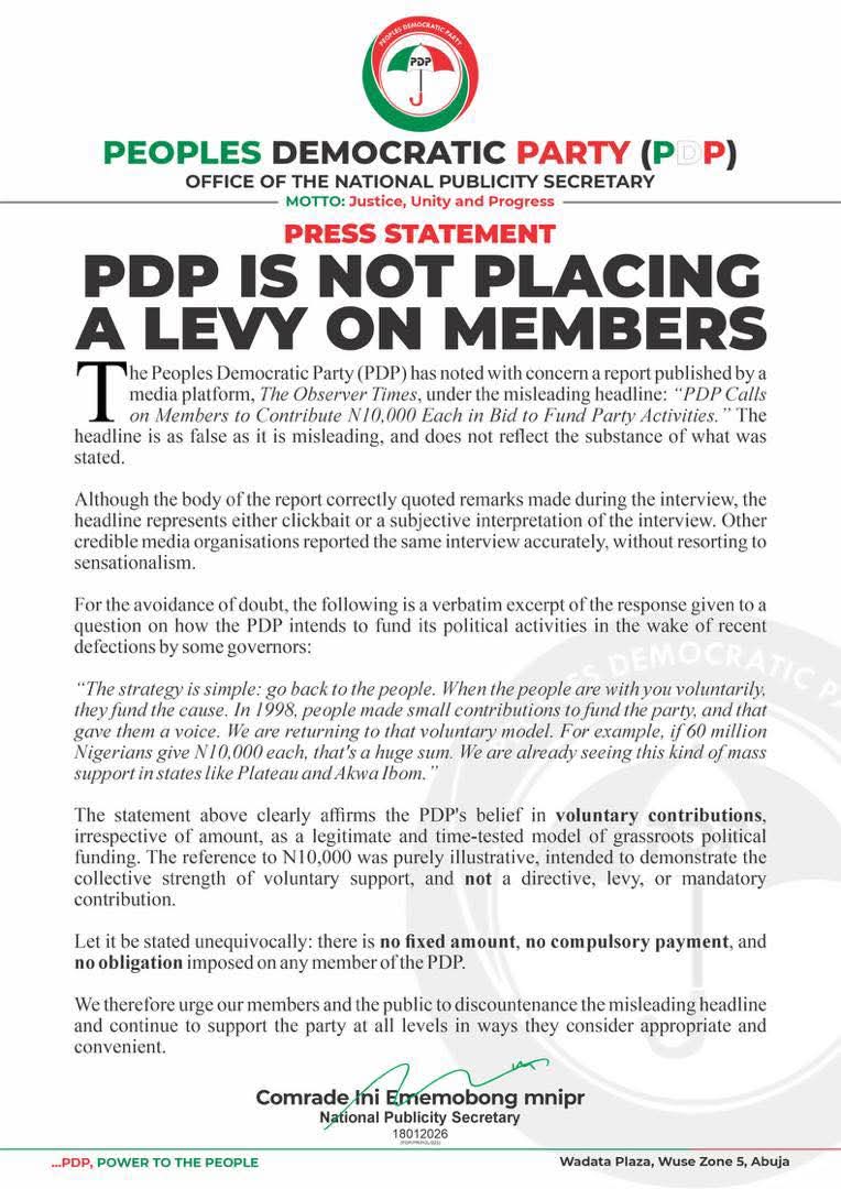 The Peoples Democratic Party (PDP) has noted with concern a report published by a media platform, The Observer Times, under the misleading headline: “PDP Calls on Members to Contribute N10,000 Each in Bid to Fund Party Activities.” The headline is as false as it is misleading, and does not reflect the substance of what was stated.