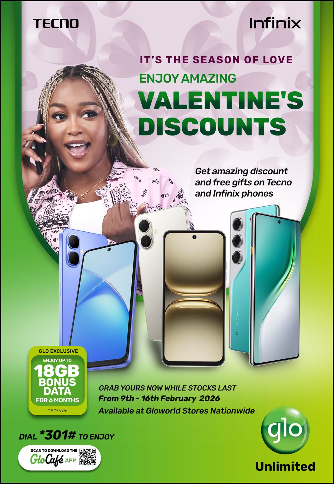 Globacom has announced the launch of its Valentine Smartphone Promo which offers amazing discounts on a wide range of premium smartphones from leading brands, including Samsung, Infinix and Tecno.