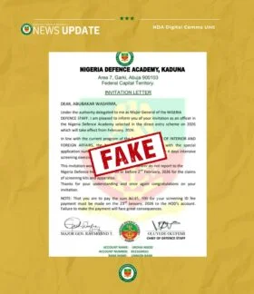 The Nigerian Defence Academy (NDA) has alerted the public to a fake invitation letter circulating online, purportedly issued to one Abubakar Washima, claiming that he was selected for admission into the academy.