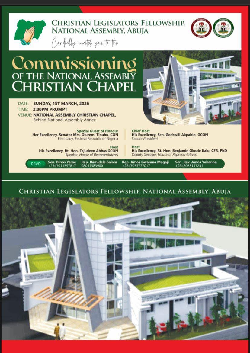 The Christian Legislators Fellowship of the National Assembly announces the commissioning of the National Assembly Chapel, scheduled to take place on Sunday, 1st March 2026 at 2:00 PM within the National Assembly Complex, Abuja.