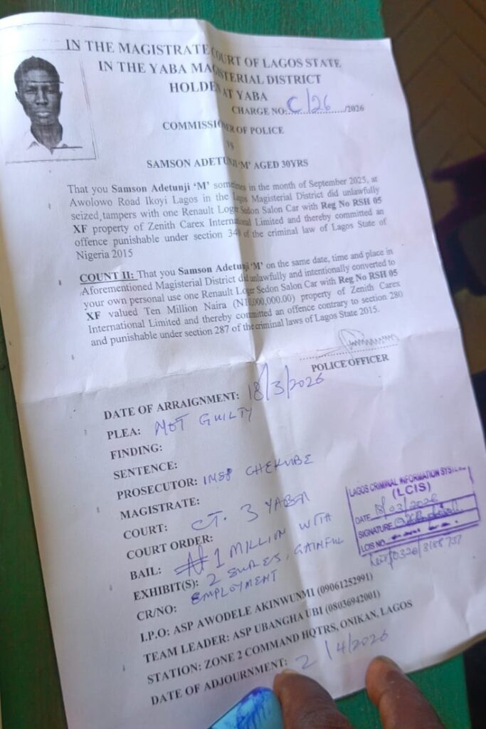 According to charge sheet with charge NO/2026, obtained by SaharaReporters, count one read, “That you Samson Adetunji ‘M’ someines in the month of September 2025, at Awolowo Road Ikoyi Lagos in the lags Magisterial District did unlawfully seized, tampers with one Renault Loger Sedon Salon Car with Reg No RSH 05 XF property of Zenith Carex International Limited and thereby committed an offence punishable under section 340 of the criminal law of Lagos State of Nigeria 2015.”